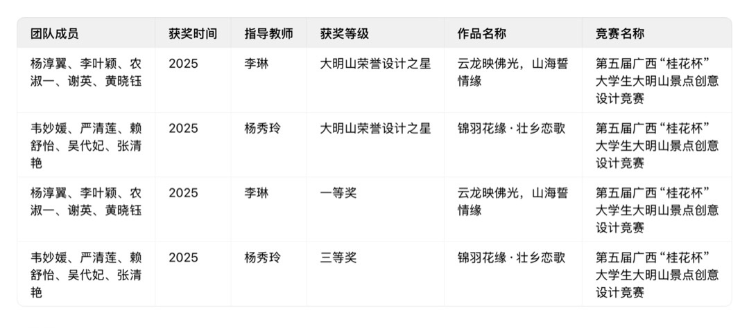 近日,2025年广西“桂花杯”大学生大明山景点创意设计竞赛落下帷幕。m88在线客服园林专业两支队伍在竞赛中表现亮眼,荣获“大明山荣誉设计之星”称号,分别斩获一等奖、三等奖各1项,李琳老师获“优秀指导教师”称号,实现了m88在线客服在该赛事上的新突破。