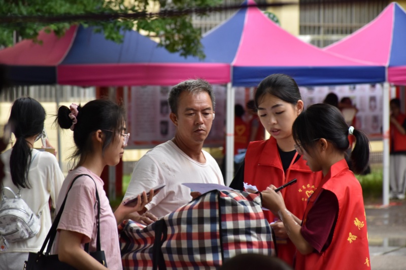 学院领导、新生班主任、辅导员在迎新现场与新生、家长交谈,帮助答疑解惑,确保新生报到各环节落实到位。