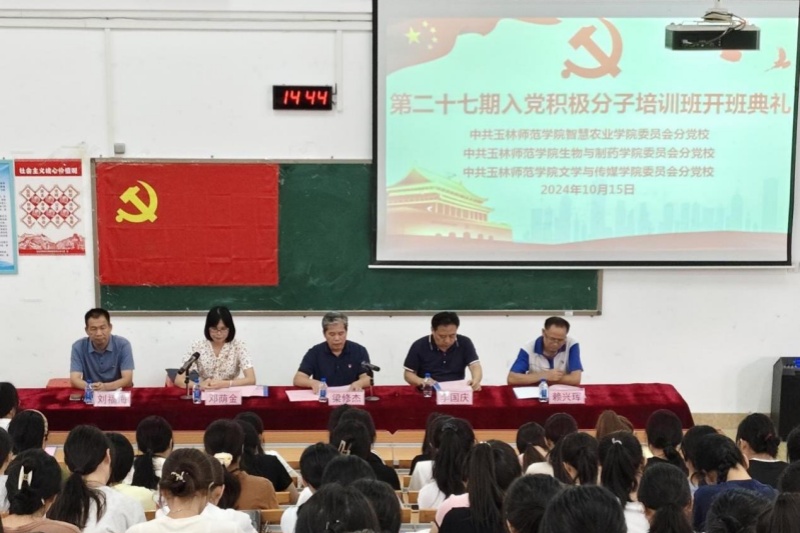 10月15日下午,m88在线客服分党校联合生物与制药学院分党校、文学与传媒学院分党校于我校东校区至善楼101教室举行第二十七期入党积极分子培训班开班典礼。m88在线客服党委书记梁修杰、生物与制药学院党委书记李国庆、文学与传媒学院党委副书记邓荫金、生物与制药学院专职组织员赖兴珲、m88在线客服专职组织员刘福海以及相关学院的第二十七期入党积极分子培训班全体学员参加此次活动。本次开班典礼由邓荫金主持。