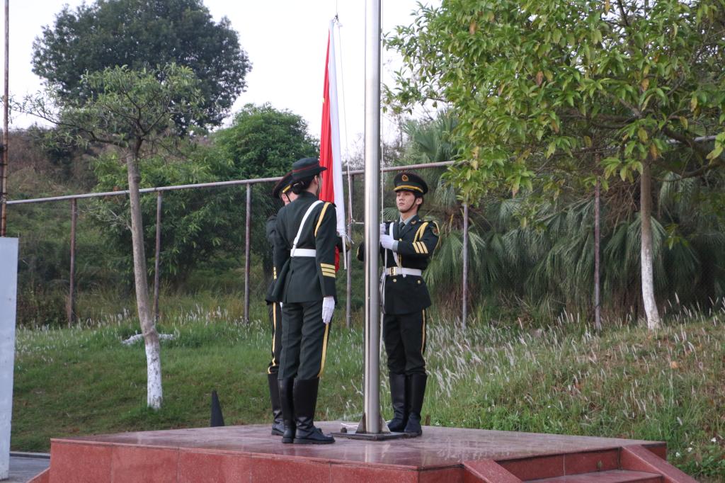 清晨7时,国旗护卫队身着笔挺的军装,踏着铿锵有力的步伐,护送鲜艳夺目的五星红旗庄严走向升旗台。在雄壮的《义勇军进行曲》中,五星红旗冉冉升起,在熠熠晨光中迎风飘扬。全体师生肃立,行注目礼,高唱国歌。