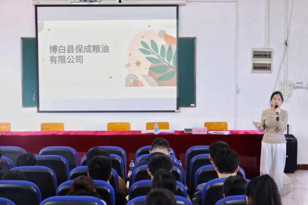 博白县保成粮油有限公司行政专员冯秋凤从公司概况、福利待遇、办公环境等进行介绍,财务主管吴燚就公司发展历程、未来规划进行深入讲解,并指出公司目前正处于快速发展时期,期待更多专业人才的加入,共促企业蓬勃发展。
